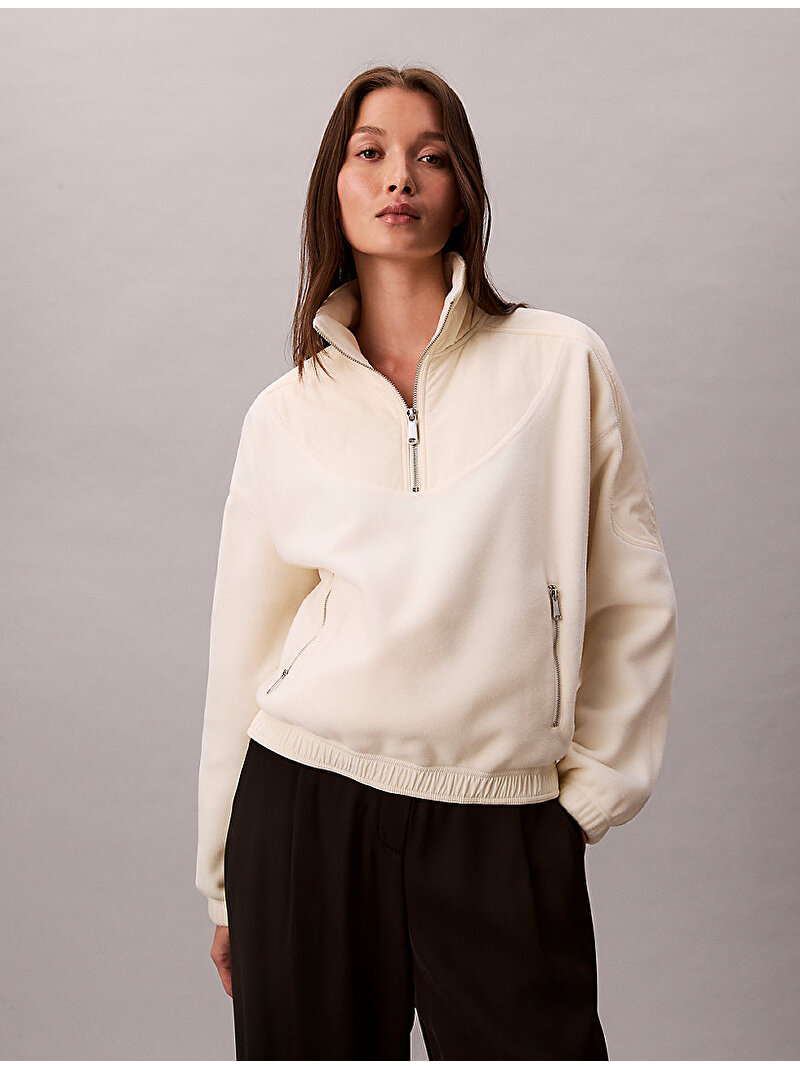 Pelüş polar kumaştan üretilen bu fermuarlı yaka sweatshirt, soğuk havalarda rahatlık için vazgeçilmez parçanızdır.