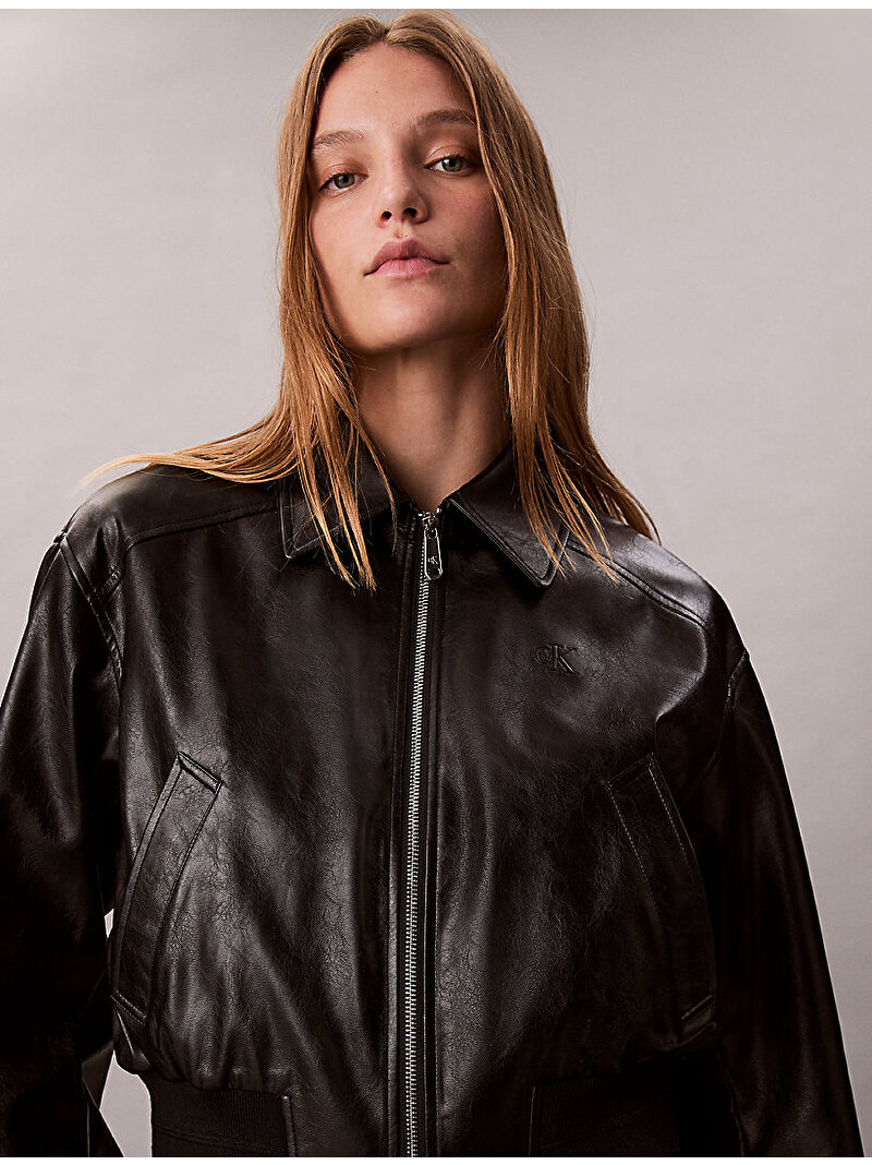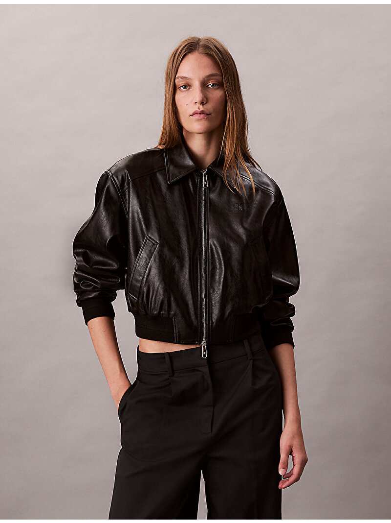 Klasik bomber cekete taze bir dokunuş: şık suni deriden güncellenmiş crop kesim tasarım.