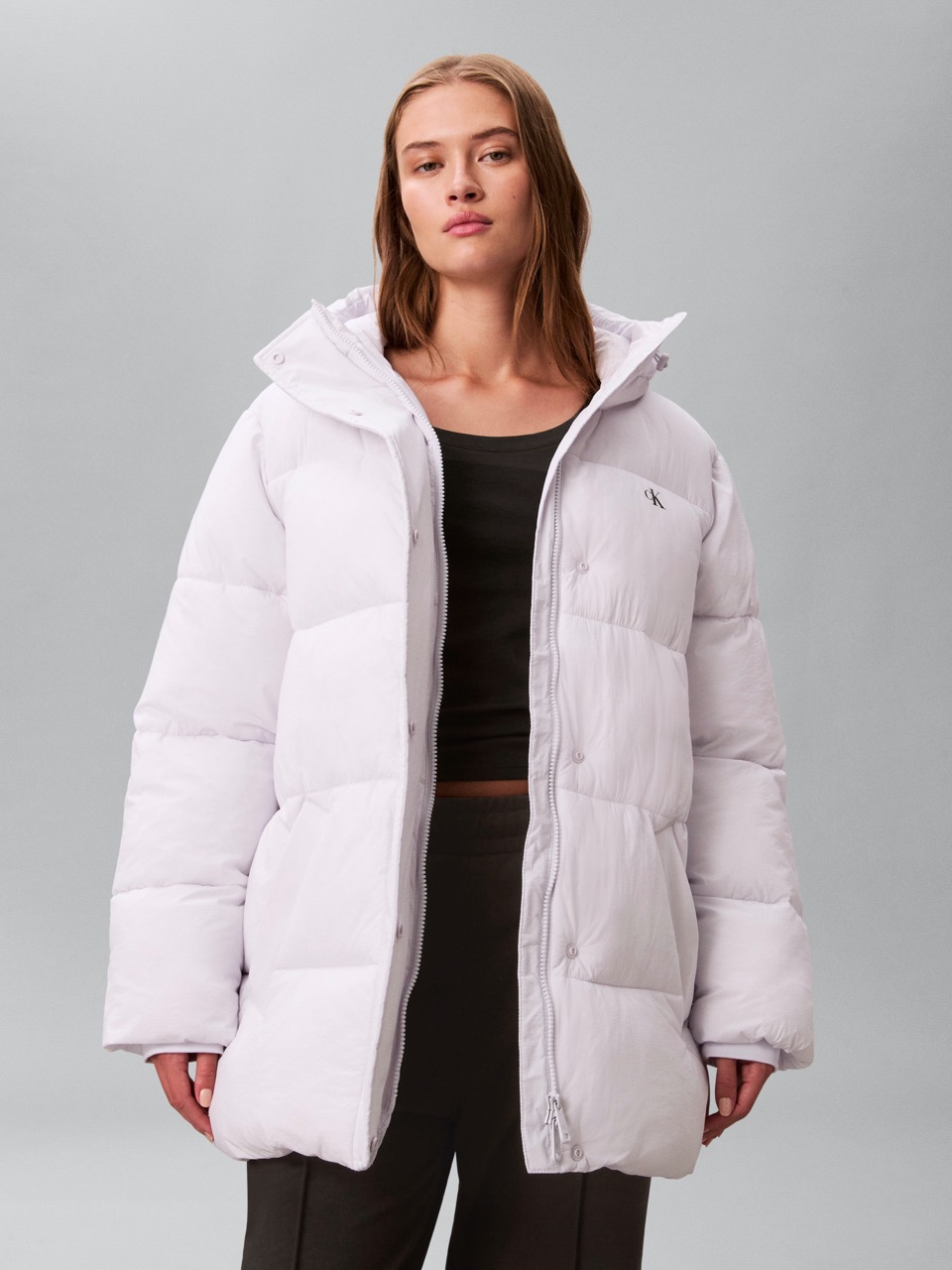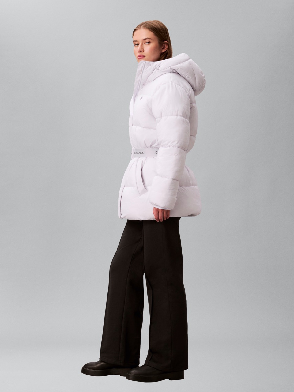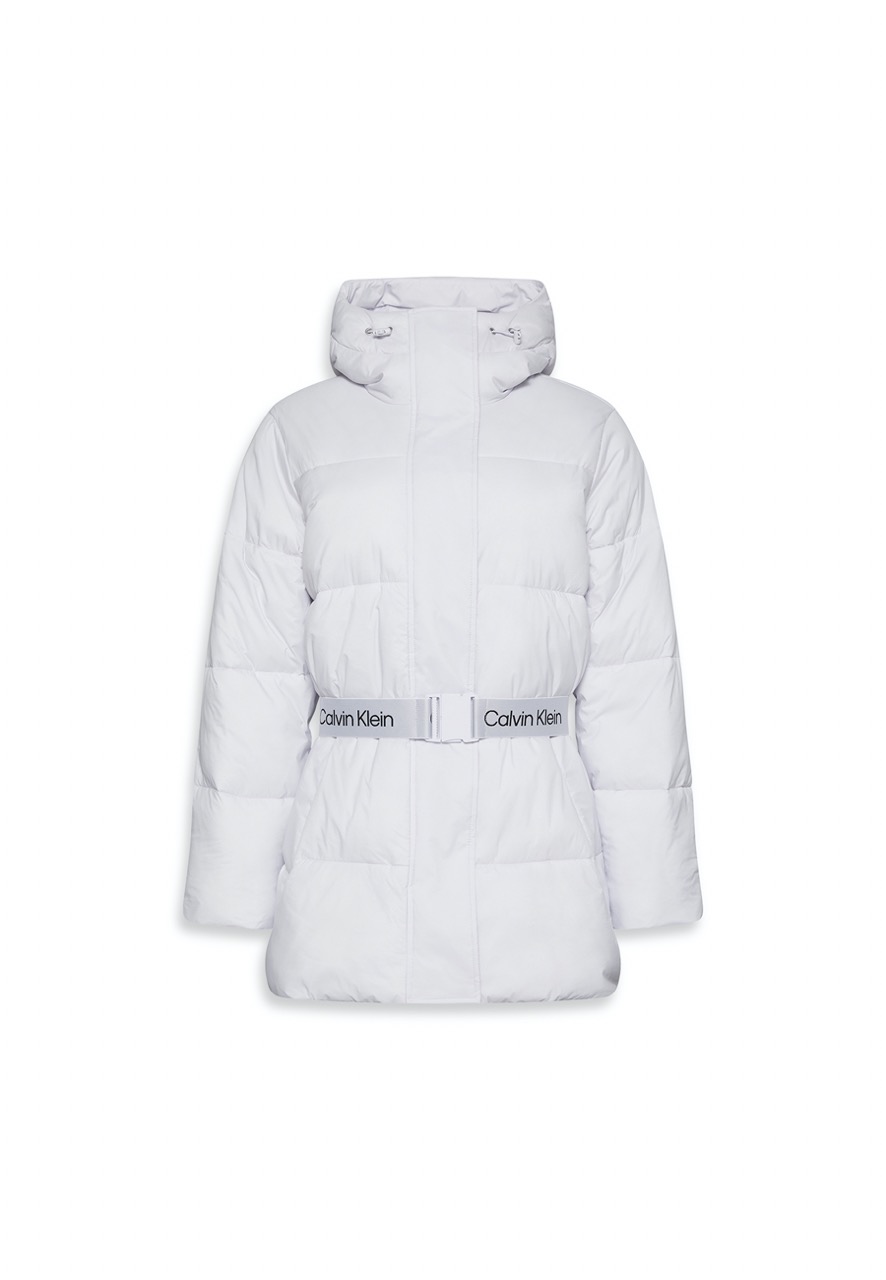 Soğuk havalar için gerçek bir Calvin Klein ikonu: Bel kısmı imza kemerle vurgulanan, sıcak dolgulu kapüşonlu şişme montumuz.