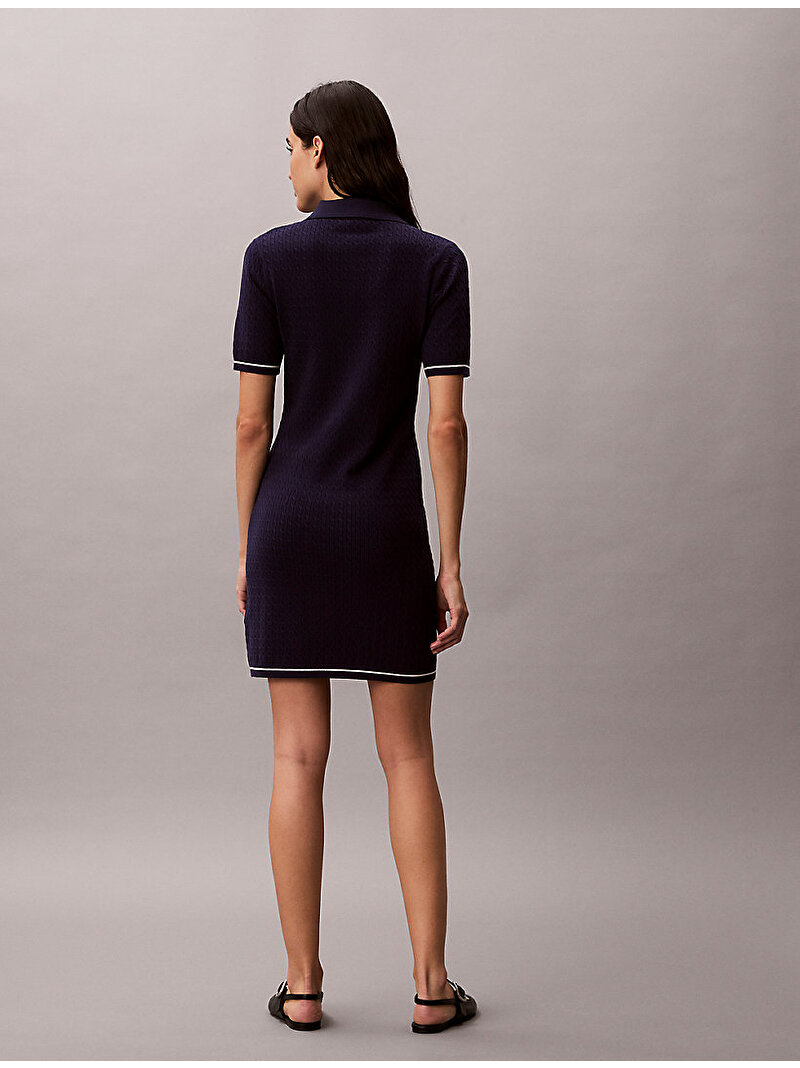 Monogram detaylı bu mini elbise, konforlu kablo örgü triko dokusunu polo silüetiyle birleştirerek günlük ve sportif bir estetik yaratıyor.