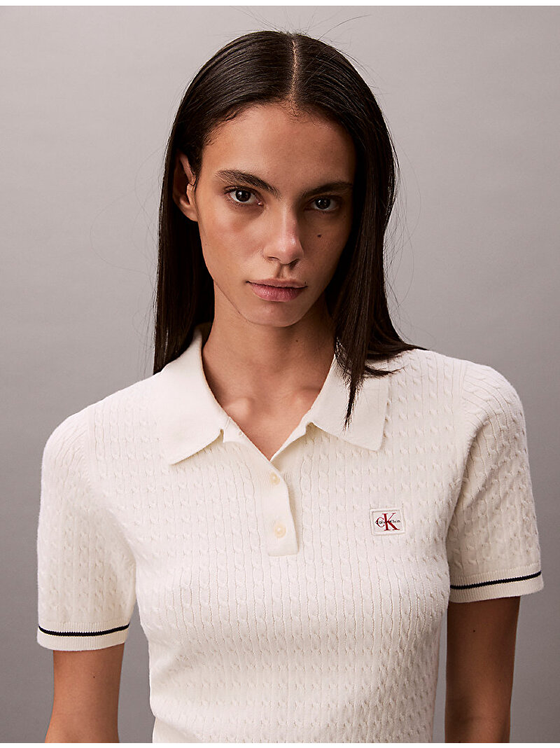 Monogram detaylı bu mini elbise, konforlu kablo örgü triko dokusunu polo silüetiyle birleştirerek günlük ve sportif bir estetik yaratıyor.