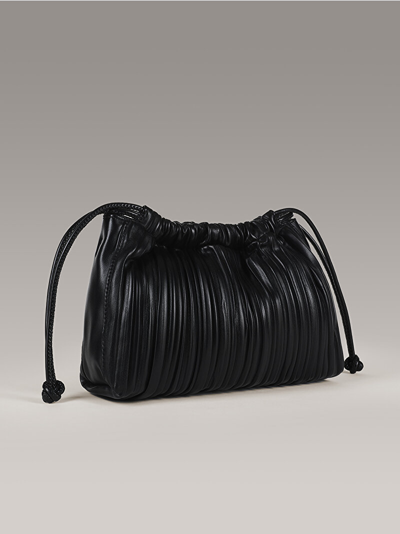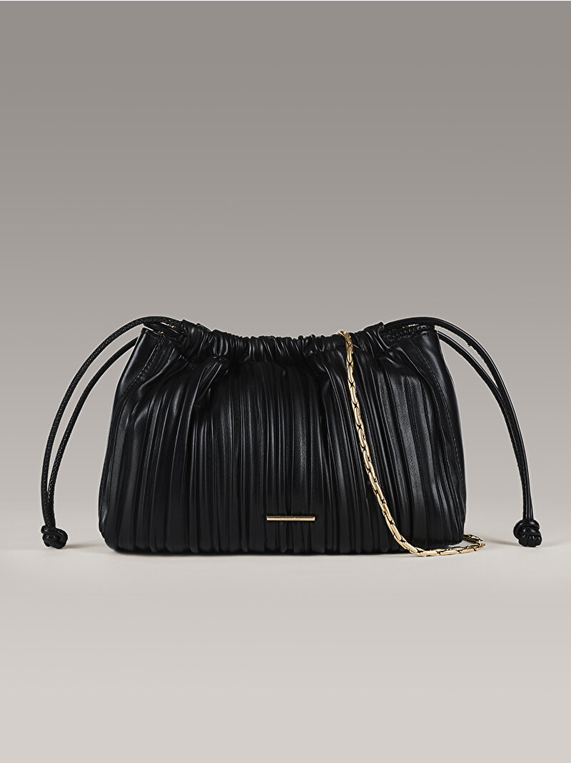 Ultra yumuşak pliseli suni deriden üretilen bu çanta, zarif bir büzgü kordonlu kapamaya ve üst düzey bir his için mücevherlerden ilham alan birinci sınıf bir zincir kayışa sahiptir.