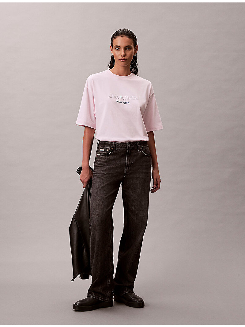 Göğüs kısmında parlak payetli imza logosuyla bu ikonik CK tişört, günlük kombinlere göz alıcı bir dokunuş katar.