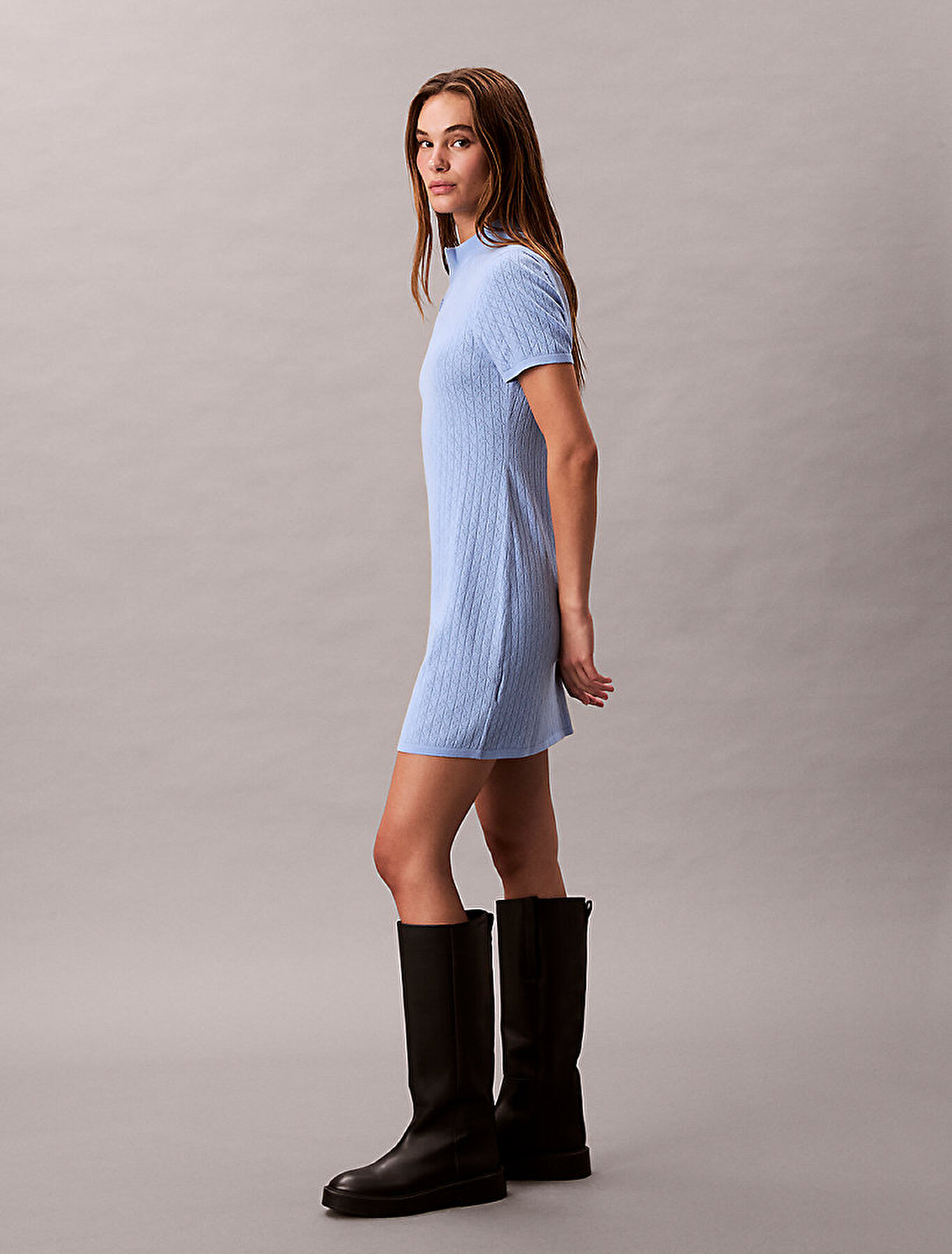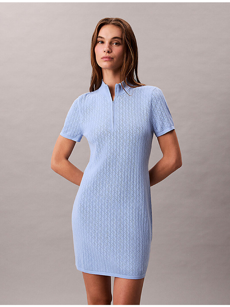 Yeni CK amblemi logosuna sahip yumuşak örgü malzeme, bu sportif fermuarlı yakalı elbiseye lüks bir dokunuş katıyor.