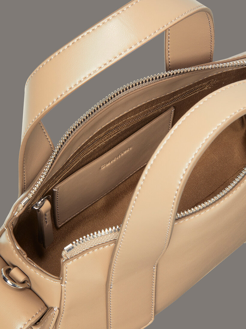 Pürüzsüz suni deriden üretilen bu yapılandırılmış çanta, zarif tasarımı özenle optimize edilmiş bir iç düzenle birleştiriyor. İmzalı bir dokunuş için jakarlı Calvin Klein dokuma ile tamamlanıyor.