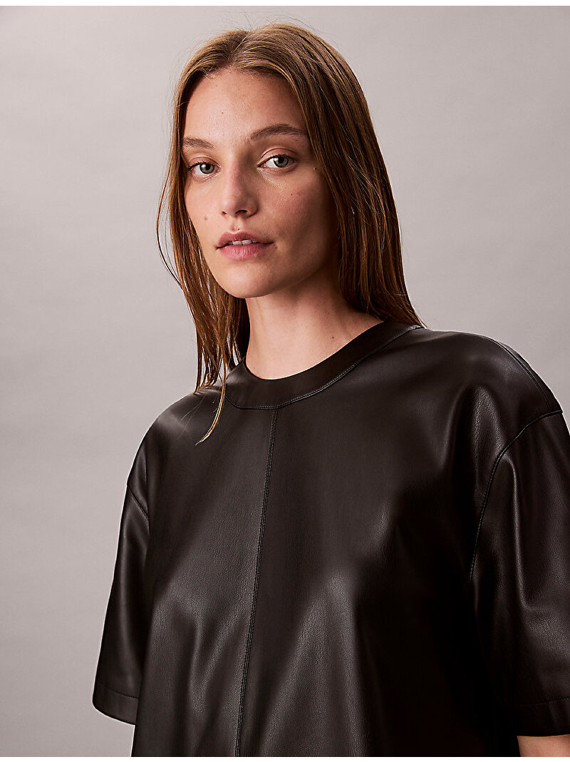 Klasik tişört silüetine şık bir yorum getiren bu deri görünümlü elbise, kıyafetinize modern bir hava katıyor.